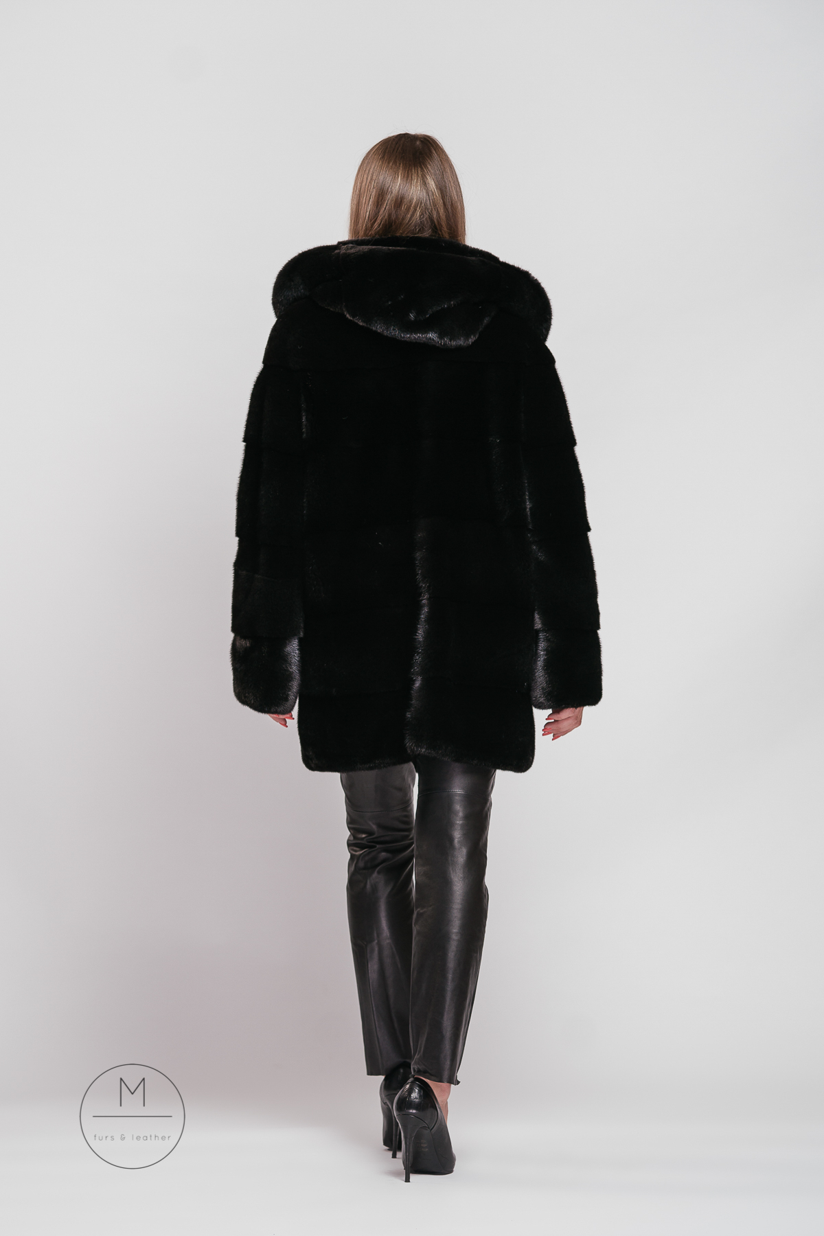 Model deosebit, culoarea neagra intensa, par scurt si dens, aspect catifelat, croiala moderna dreapta, cu maneci legere care denota eleganta. Este accesorizata cu un cordon din piele naturala, gluga ampla si bogata protejandu-te de intemperiile sezonului rece. Haina de vizon are o captuseala care ofera o senzatie de finete si vine in completarea acestei piese unice.